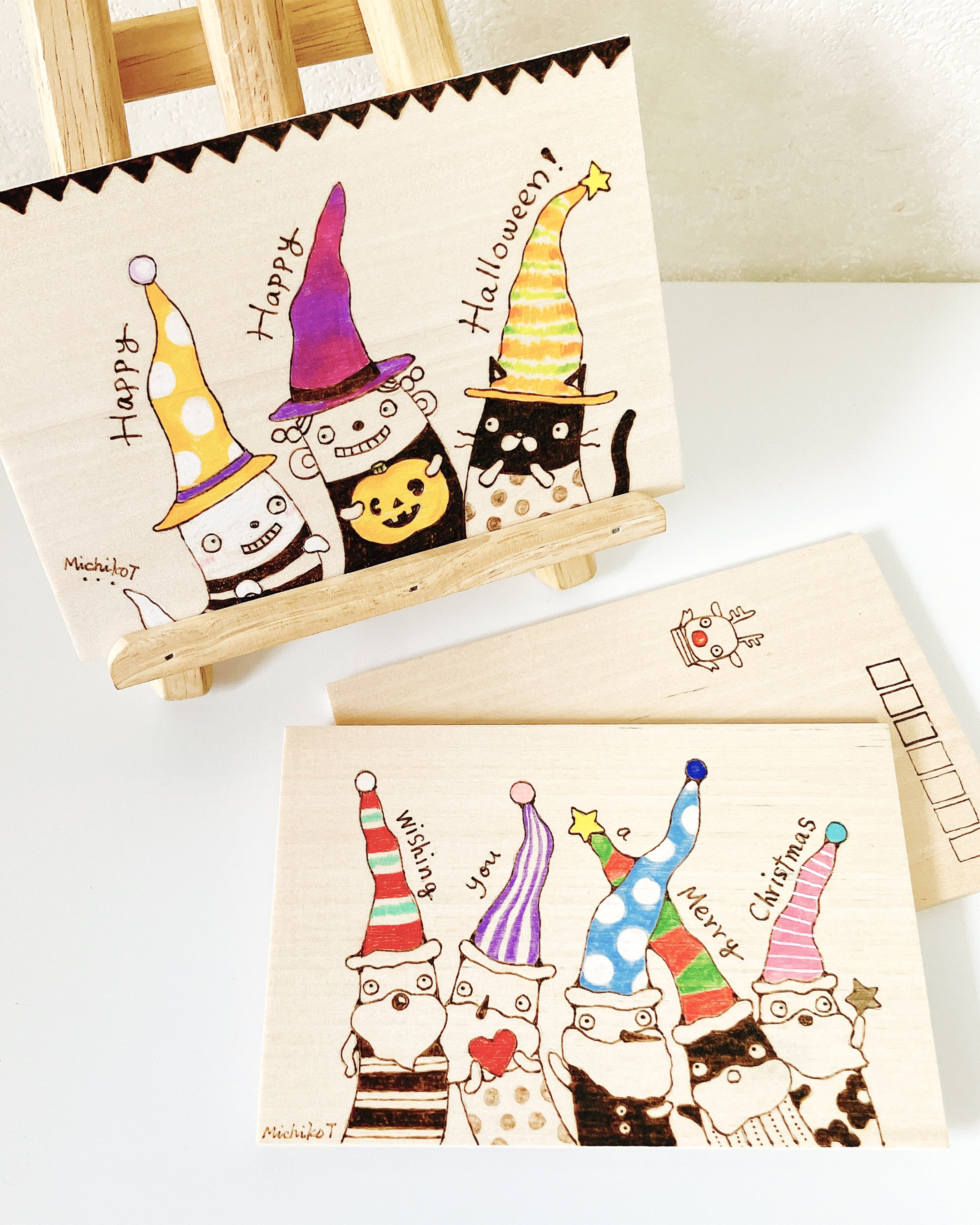 ウッドバーニングで愉快なハロウィン、またはクリスマスのカードを仕上げます。