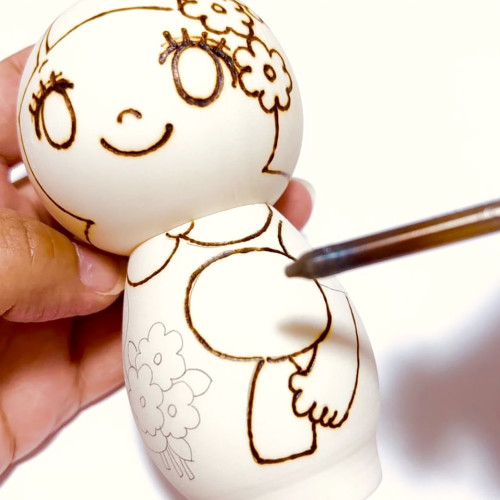 白木素材のドールに、電熱ペンを使って顔や手、お洋服の模様を焦がして描き、自分だけのこけしドールを作りましょう!