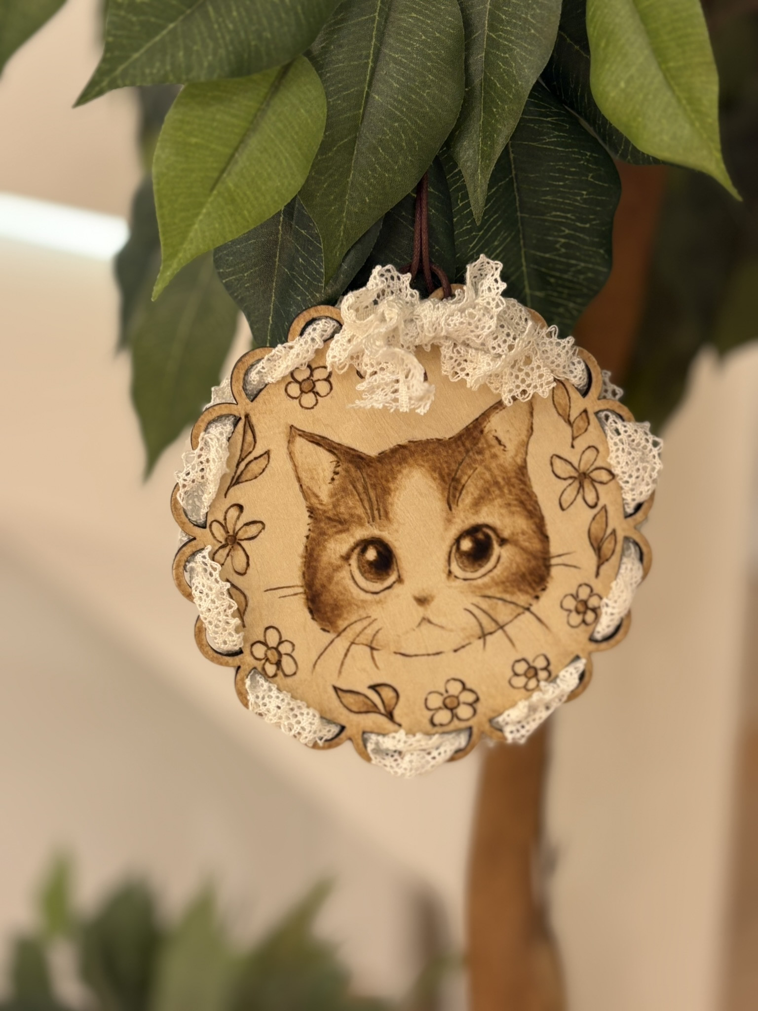 レース模様にカットされた板に、猫の絵をウッドバーニングで描きましょう!